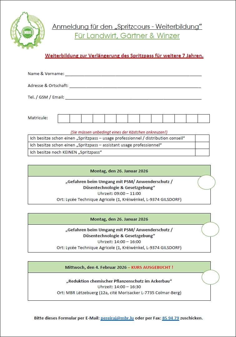 Der Maschinenring MBR Lëtzebuerg übernimmt die Anmeldung für die Spritzpasskurse im Auftrag der ASTA und in Zusammenarbeit mit dem Lycée Technique Agricole.