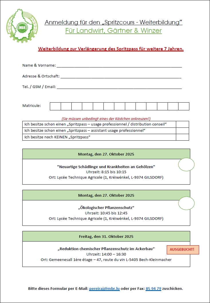 Der Maschinenring MBR Lëtzebuerg übernimmt die Anmeldung für die Spritzpasskurse im Auftrag der ASTA und in Zusammenarbeit mit dem Lycée Technique Agricole.